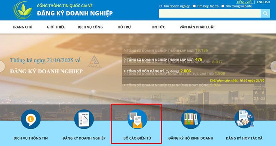 - Bước 1: Truy cập Cổng thông tin quốc gia, chọn mục “Bố cáo điện tử”;