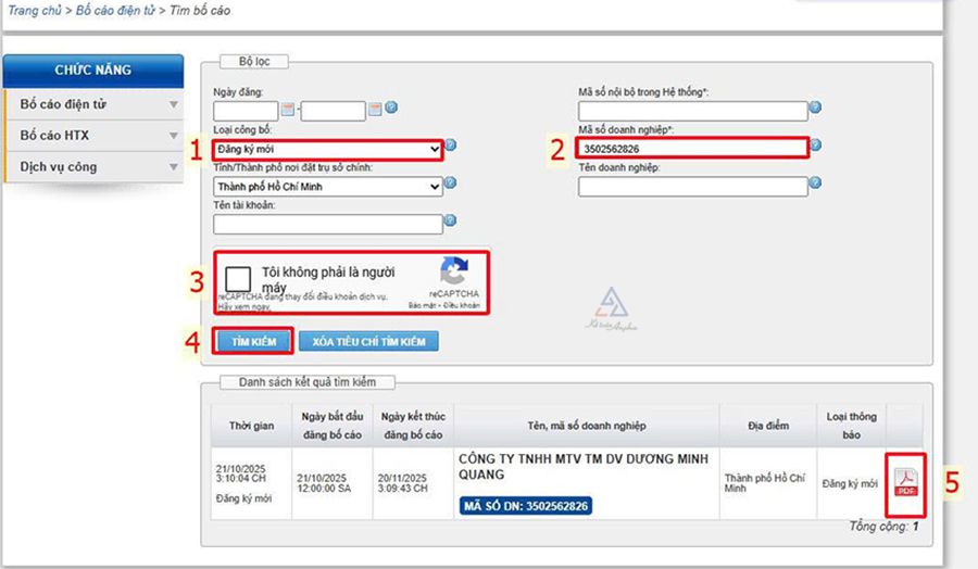 - Bước 3: Chọn loại bố cáo và điền mã số thuế doanh nghiệp sau đó ấn “Tìm kiếm”.