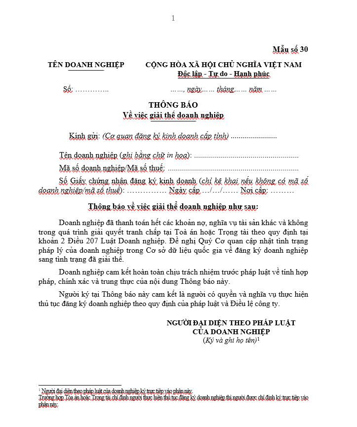 - Thông báo giải thể hộ kinh doanh ( Phụ lục I ban hành kèm Thông tư 68/2025/TT-BTC có quy định về Thông báo về việc giải thể doanh nghiệp tại Mẫu số 30 )